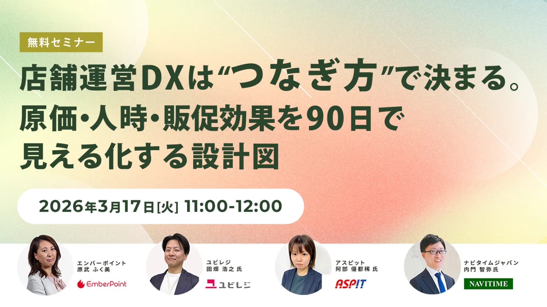 注目記事2024.12.10読む >>「SARAH」による革新的なブロックチェーン「ONIGIRI C...俺のサービスを聞け2024.12.06読む >>ダイヤモンドダイニングも導入。「カンタン」を追求したユビレジのP...飲食店のDX「はじめの一歩」2024.11.27読む >>【飲食店最前線巡り #10】 ソウルの外食事情飲食店最前線巡りⅡ記事一覧を見る海外飲食DXニュース2024.09.30読む >>選択肢を絞りリピーター増加!DoorDashが飲食店向けにアプリ...海外飲食DXニュース2024.09.17読む >>ゲーム×クーポンで飲食店への再来店を促進!Checkers an...海外飲食DXニュース2024.09.09読む >>料理画像で集客力アップ!AI搭載のアプリ「MenuSnap」が飲...海外飲食DXニュース記事一覧を見る飲食DX はじめの一歩2025.04.16読む >>集客最大化の「STORE PAD」で Google経由予約が10...飲食店のDX「はじめの一歩」2025.04.11読む >>業態に“ベストフィット”した 店舗オペレーションシステムを ...飲食店のDX「はじめの一歩」2025.02.05読む >>条件に合った求職者に“自動送信”。 効率的に欲しい人材にアプロ...飲食店のDX「はじめの一歩」記事一覧を見るおすすめイベント開催日:2026年3月24日(火)14:30〜16:30読む >>【3月ダイコレ関西】“志の共鳴” 〜ともに、飲食の未来を創り出す〜株式会社dinii開催日:2026年3月18日(水)14:00~16:00読む >>「飲食店をはじめる前に」~進め方、事例、インボイス制度~株式会社USEN開催日:2026年3月17日(火) 11:00〜12:00読む >>店舗運営DXは“つなぎ方”で決まる。原価・人時・販促効果を90日で...株式会社アスピット株式会社ユビレジイベント一覧を見るDDM作成予約デジタルデザインマップ無料作成依頼日程予約フォーム(Spir)の画面に推移しますDDMってなに?直近イベントもっと見る人気記事読む >>2024.08.08【飲食店最前線巡り #8】賛否あるサイゼリヤのモバイルオー...飲食店最前線巡りⅡ読む >>2024.10.29 「人を大事にすること」に集中して、価値を生まないものには...イベントレポート読む >>2024.10.25【竹田クニ】「人」と「テクノロジー」のハイブリッド!“○か...竹田クニのインサイトもっと見る記事を探す記事一覧イベント・セミナーカテゴリで探すライターで探すタグで探す