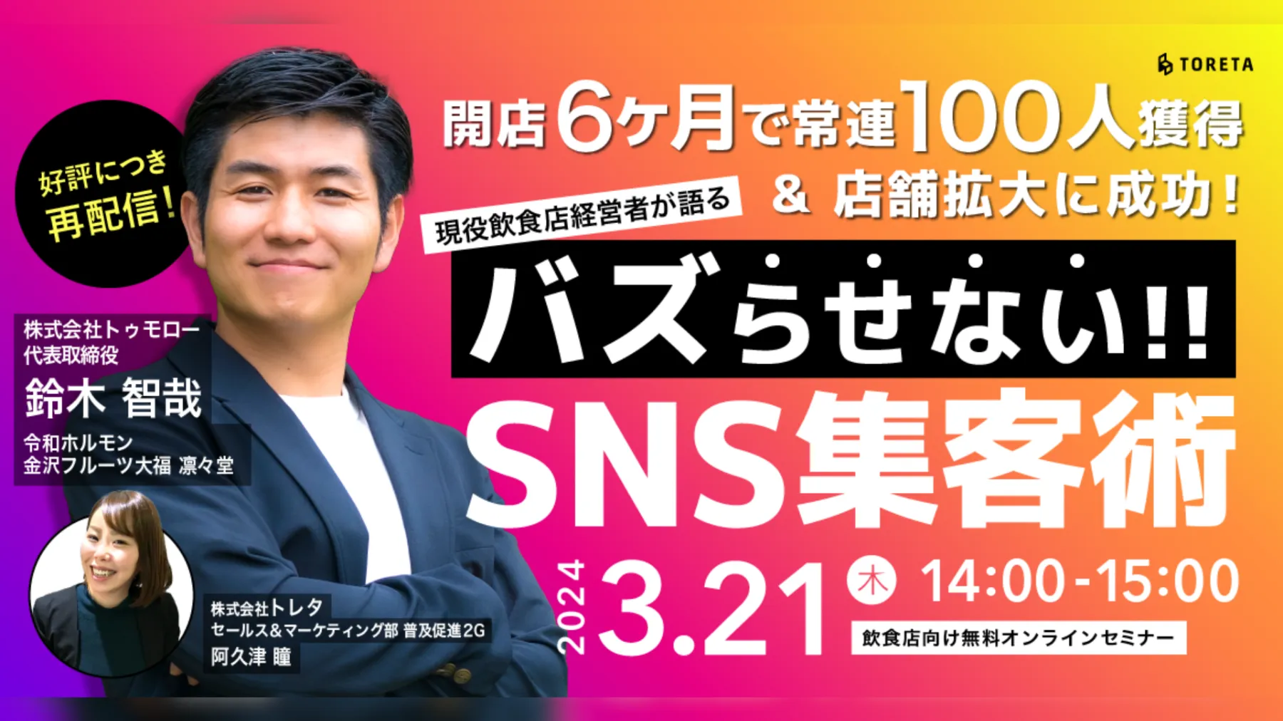 このセミナーでは、令和ホルモン、金沢フルーツ大福 凛々堂などの人気飲食店を創業した株式会社トゥモローの鈴木 智哉氏に、長く愛され続けるお店にするための「バズらせないSNS集客術」を解説いただきます。飲食店経営者として実際に実践してきた集客の考え方と手法をご紹介いただくことで、より実践的な戦略を知ることができます。