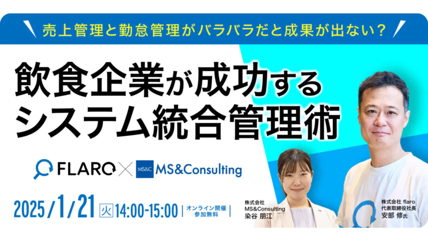 飲食業界では、組織が拡大するフェーズに応じて取り組むべきDXが異なります。本セミナーでは、大手チェーン企業で拡大期から上場までバックオフィス改革を手がけ、現在も多くの大手企業で経営企画の参謀として活躍されている株式会社flaro 代表取締役 安部氏をお招きし、具体的な事例を交えながら「売上管理」や「勤怠管理」などのシステム統合のポイントや成功の鍵を解説していただきます。