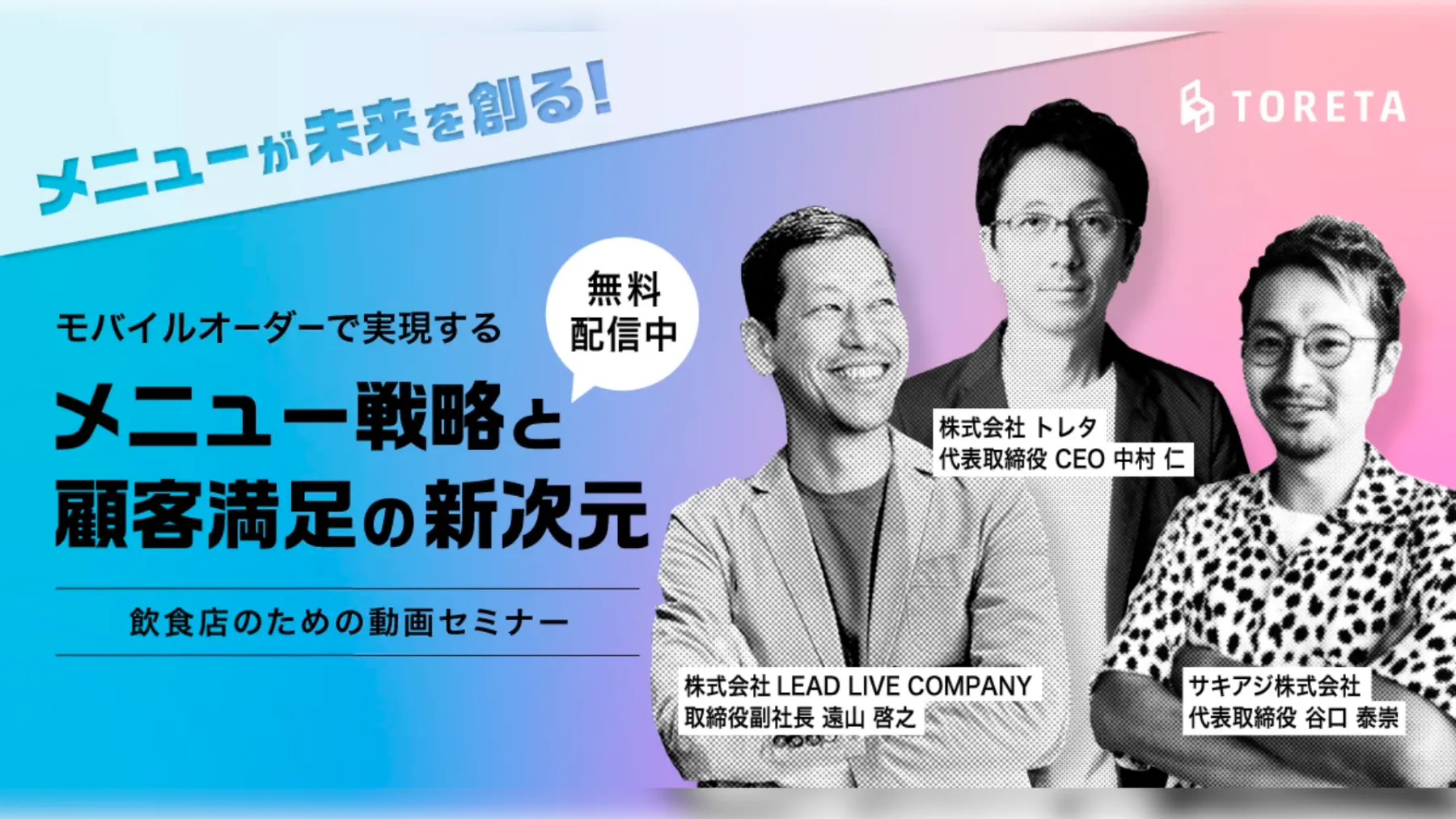 450社以上のメニューディレクションの実績を持つ谷口 泰崇 氏(サキアジ株式会社 代表取締役)、年間100件以上の接客や教育に関する研修・セミナーを開催する遠山 啓之 氏(株式会社LEAD LIVE COMPANY 取締役副社長)をゲストにお招きし、これからの時代のメニューブックや接客のあるべき姿についてお伺いしていきます。