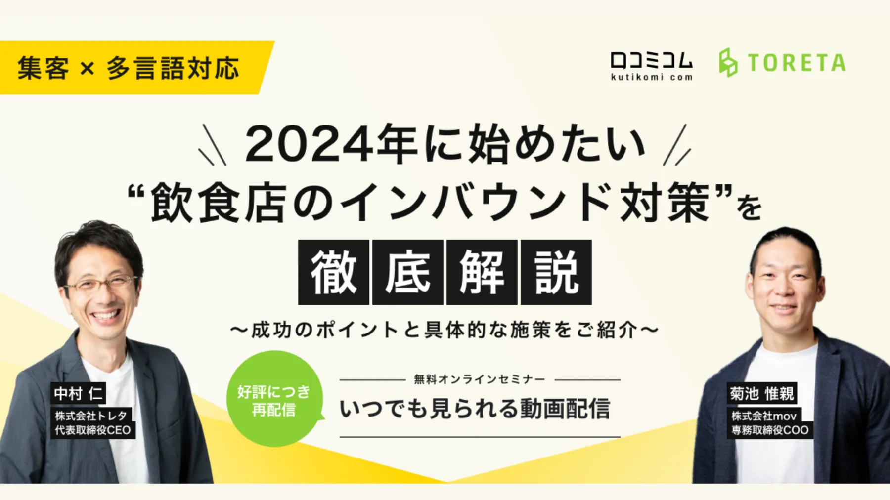 そういった方のために、「訪日コム」を運営する株式会社movの専務取締役 菊池氏とトレタ代表の中村から「2024年に向けて実行したいインバウンド対策」をご紹介します。
