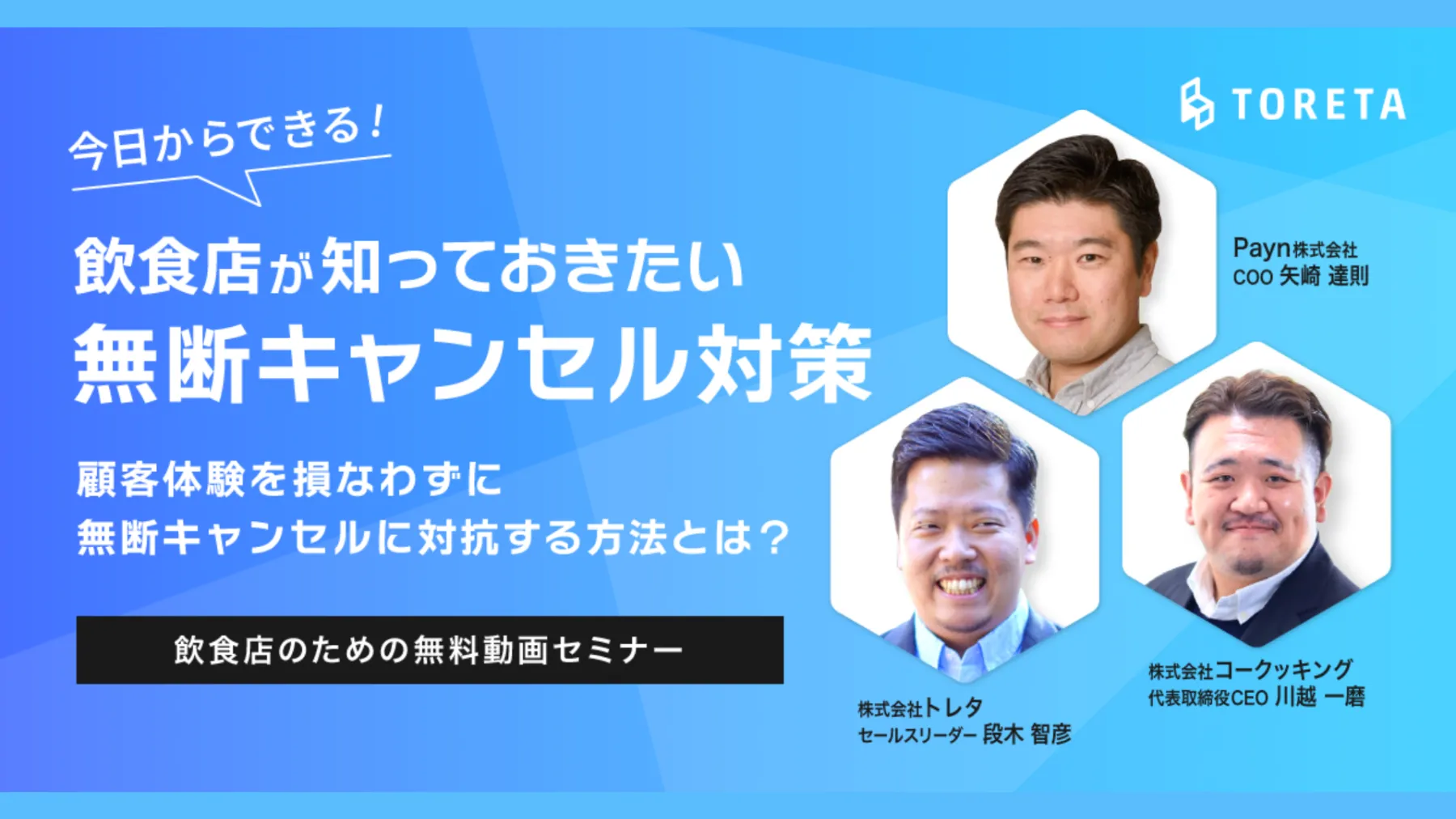 この時代の流れに対して飲食店はどのように対策すべきなのでしょうか?本セミナーではPayn株式会社(キャンセル料請求自動化サービス)の矢崎 達則 氏、株式会社コークッキング(フードシェアリングサービス「TABETE」を運営)の川越 一磨 氏をゲストにお招きし、飲食店における無断キャンセルの現状や無断キャンセルによる被害を顧客体験を損なうことなく減らす方法についてお話しいただきます。