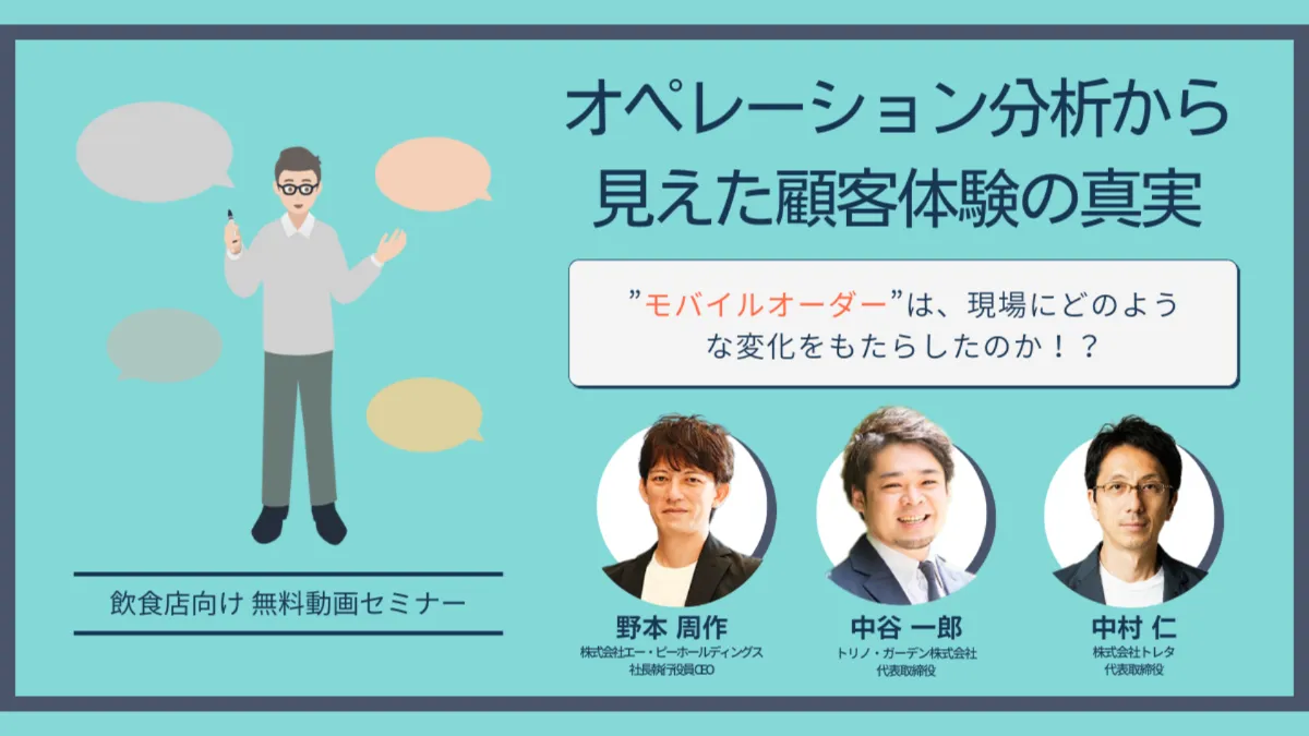 この動画セミナーでは、モバイルオーダーを導入した塚田農場に起きたオペレーションや顧客体験の変化について、株式会社エー・ピーホールディングスの野本周作 氏(社長執行役員 CEO)をゲストにお話を伺います。