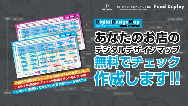 飲食店を取り巻く様々な事情から、DX(デジタルトランスフォーメーション)は飲食店がこの先生き残るために最も重要な取り組みです。デジタルデザインマップを作成し、業務プロセスとITツールの関係を最適化することで、限られた人材で最大の効果を発揮し、競争力を維持する仕組みをレストランテック協会でご支援いたします。