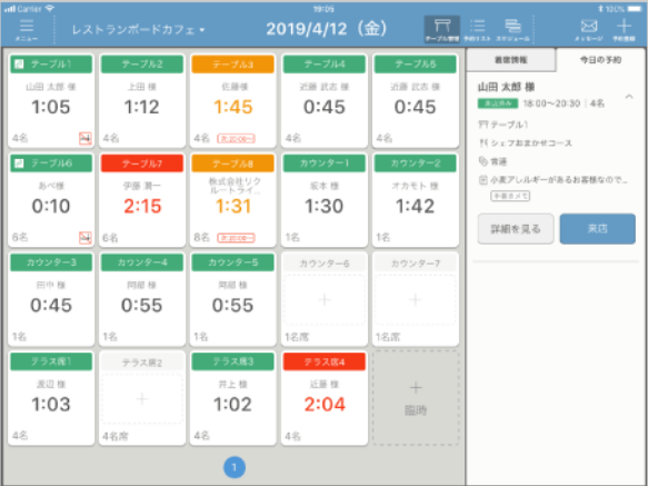 店舗管理ツールにある「来店管理」機能を使って、卓の滞在時間、着席人数がリアルタイムで表示され、また各卓の「稼働率」データを蓄積することが可能。配席ミスの傾向や、曜日や時間帯別の組人数傾向分析によって最適な配席を実現するための有効なデータとなります。